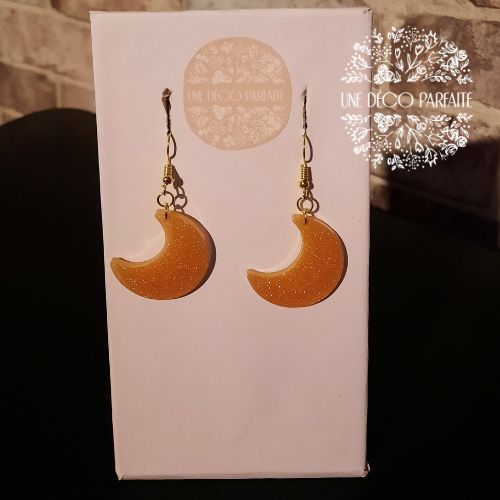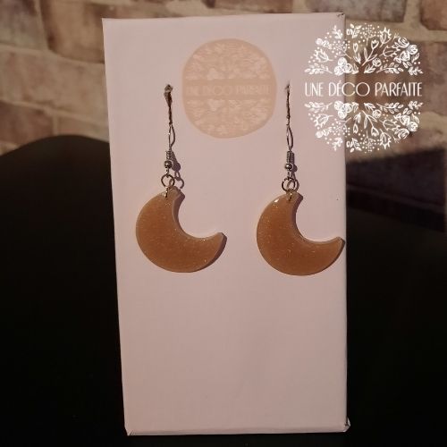 Cette paire de boucles d’oreilles en forme de lune mesure 3 cm de large par 3 cm de long. Elles sont fabriquées en résine époxy et montées sur un crochet. Leur longueur totale (crochet inclus) est de 5,4 cm.